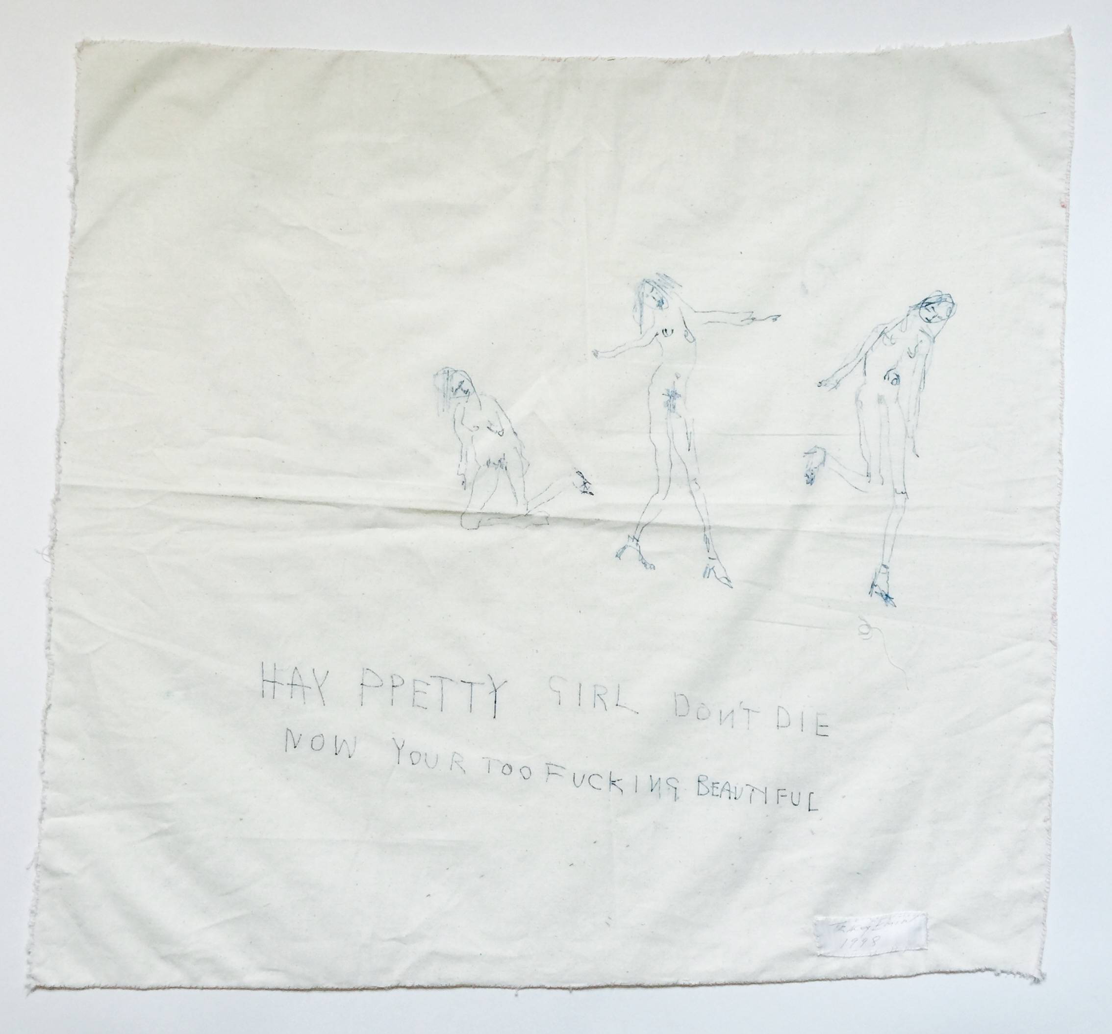 'Hay Beautiful' was produced at the same time as 'My Bed' , and is therefore to be considered from the series of monoprinted works she also exhibited at the Tate exhibition in 1999 (although it was not included in the show itself). Her use of calico is unusual for this time, and it adds another layer of poignancy given that the fabric is a cheap rather coarse alternative to cotton, originally produced by impoverished weavers in Southern India.